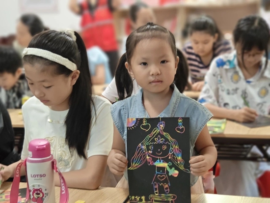 孩子開心地展示自己的刮畫作品。(同安區委文明辦供圖)