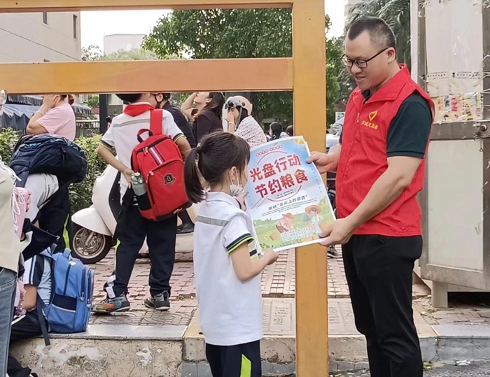 志愿者向學生宣傳“光盤行動,節約糧食”(薌城區發改局 供圖)