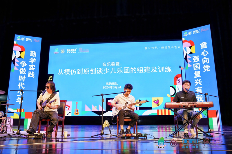 開幕式布置以藍色、黃色、紅色為主色調,現場人頭攢動、熱鬧非凡。在絢麗的開場燈光秀和《鼓樂合奏》激蕩的鼓點中,藝術展演正式拉開序幕。隨后,專業樂隊、青少年吉他愛好者等輪番上臺為現場觀眾演奏了《青蘋果樂園》《西游序曲》《大城小愛》等十多個節目。小吉他手、小鼓手們,稚嫩的臉龐搭配上自信的表演,贏得現象掌聲陣陣。