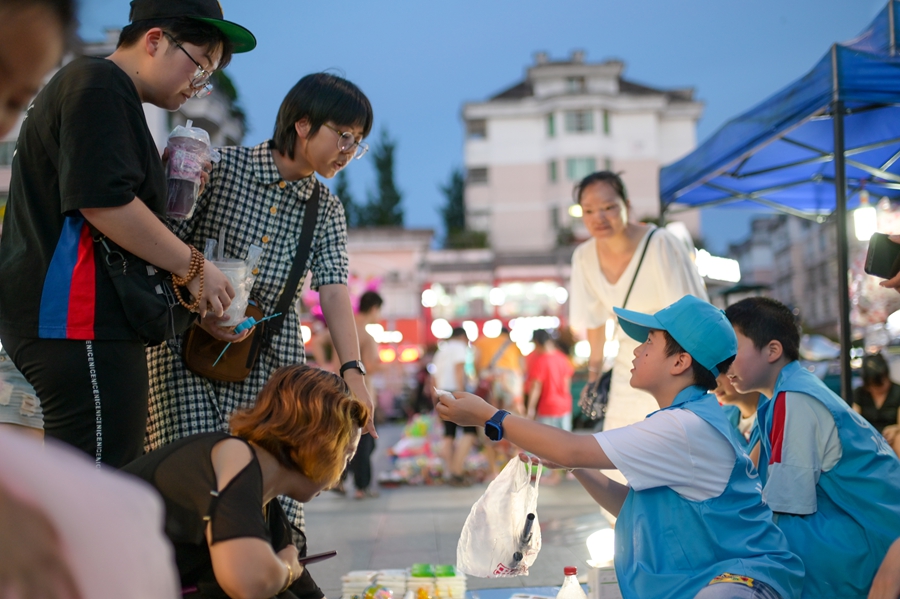 2020年7月,在浦城縣新時(shí)代文明實(shí)踐中心丹桂城市廣場開展"小小地?cái)偞笞鳛?社區(qū)治理共參與"萌娃們“出攤”義賣活動(dòng),所得收入用于騰訊99公益溫暖包線上捐款。南平市委文明辦供圖