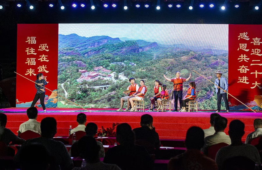 2023年度福建省新時(shí)代文明實(shí)踐項(xiàng)目大賽銀獎(jiǎng)——溪言習(xí)語政策宣講志愿服務(wù)項(xiàng)目。圖為志愿者展演《竹筏上的新時(shí)代文明實(shí)踐》情景劇。南平市委文明辦供圖