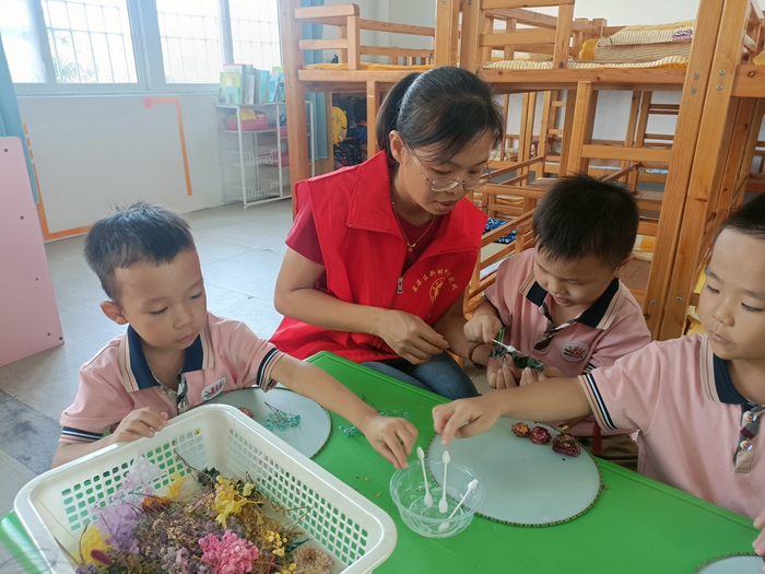 志愿者和小朋友一起制作團扇。泉港區前黃鎮供圖