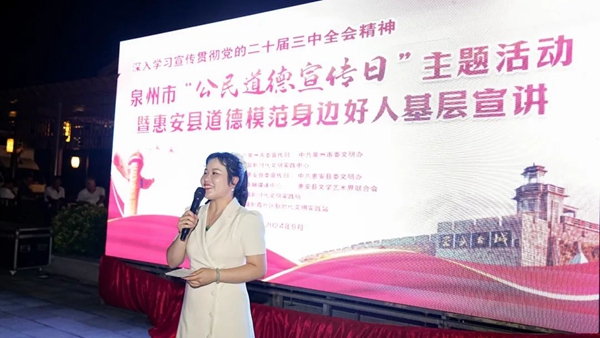 活動現場,宣講團成員用樸實無華卻充滿力量的語言和真摯的情感,生動地講述著福建省首屆(助人為樂類)道德模范陳欠水、福建省第七屆(誠實守信類)道德模范林和輝、泉州市第八屆(孝老愛親類)道德模范莊小虹的感人事跡。這些事跡不僅僅是關于個人的善行義舉,更是對社會主義核心價值觀的生動詮釋,激勵著人們向善向美,努力成為更好的自己。