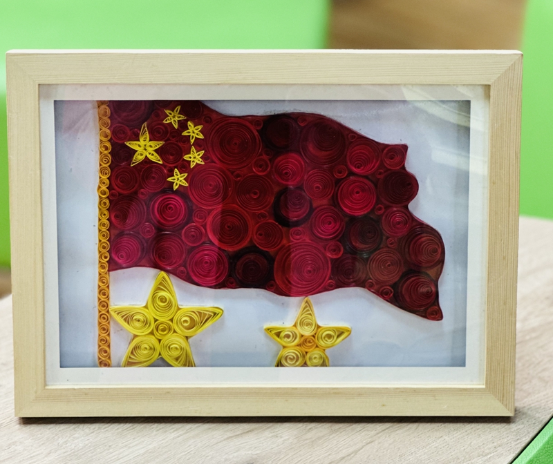 在衍紙工坊,一幅紅色的“中國地圖”衍紙畫頗為搶眼,這幅衍紙畫以一個個紅色卷紙筒拼出中國地圖的輪廓,又以一個個黃色卷紙筒拼出“中國”二字鑲嵌其中,畫面立體、穩重、大氣。衍紙畫,又稱卷紙畫,就是把一張張平面彩帶卷成一個個立體“零件”,再把一個個立體“零件”拼裝成一束花、一張畫、一幅地圖……在松航小學衍紙工坊,孩子們不僅能接觸到衍紙藝術,還能深入了解竹編技藝。