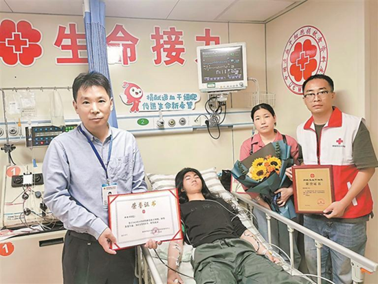 紅十字會(huì)工作人員看望正在捐獻(xiàn)造血干細(xì)胞的張健君