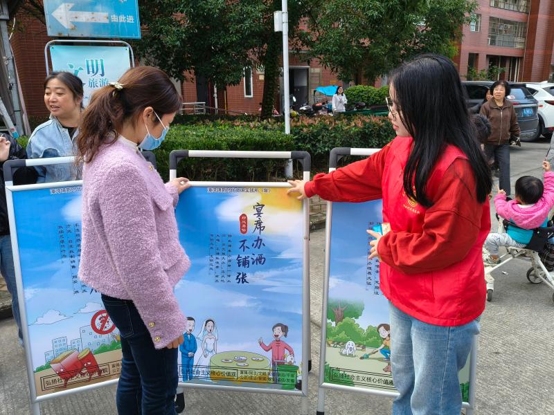 活動當天,金馬小區門口人頭攢動,氣氛熱烈。志愿者在小區的顯眼位置懸掛著醒目的橫幅,上面書寫著“抵制高額彩禮,倡導文明婚俗”“牽好‘文明繩’,養犬‘不掉鏈’”“喪事簡辦揚正氣,厚養薄葬樹新風”等宣傳標語。這些橫幅不僅傳遞了移風易俗的重要性,也吸引了眾多居民駐足觀看,并激發了他們參與文明建設的熱情。