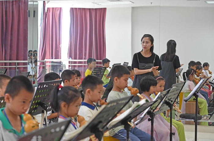 新時代文明實踐中心,兒童學(xué)習(xí)葫蘆絲。林弘梫攝