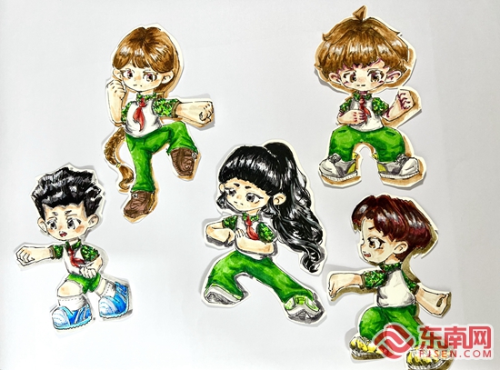 “設計‘東東’這一IP形象靈感來源于六年級陳瀅同學創作的一組軍體拳漫畫,因為國防教育是我校一大特色,學生們人人都會軍體拳,這個卡通形象也很好體現我校學子的精神面貌。”鯉城區東門實驗小學校長萬媛媛告訴記者,所以學校便決定以這組漫畫為原型設計校園IP形象。