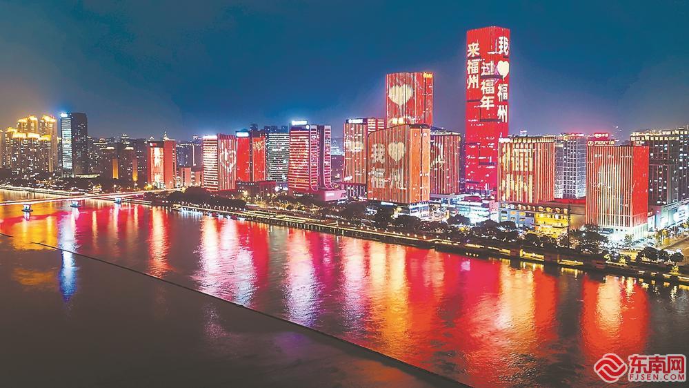 21日起,福州閩江北岸海峽金融商務區(qū)(上圖)、五一廣場、東街口等多處地標建筑推出“來福州,過福年”主題燈光秀以及在LED大屏滾動播放新春海報,充滿濃濃年味。