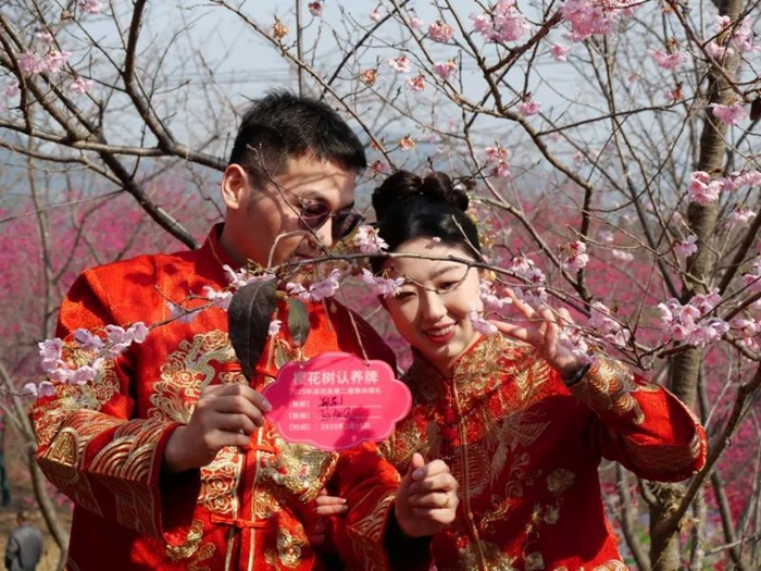 婚典儀式結束后,新人們開啟了“櫻花幸福之旅”巡游環節,在櫻花園、南山姻緣林等地巡游,在各個打卡點拍照留念,認養“愛的櫻花樹”、掛姻緣牌,將美好的愛情記憶定格在這片美麗的櫻花世界。(福建微清流)