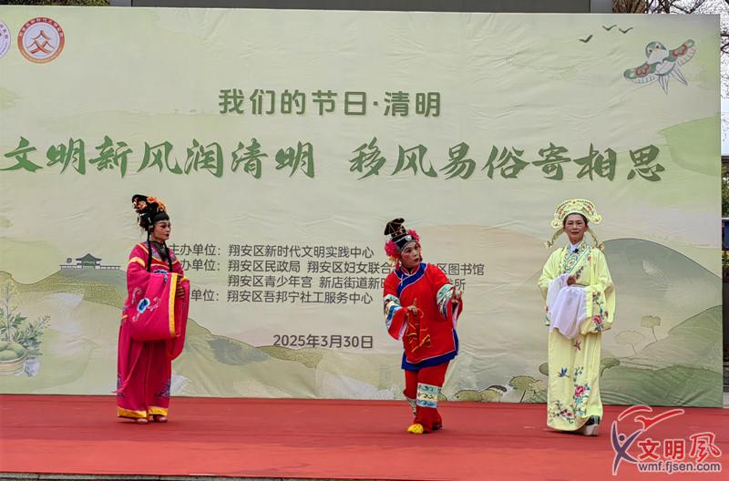 活動現場,舞臺區的表演將移風易俗理念巧妙融入藝術形式。青少年宮的孩子們朗誦《光的贊歌》,以詩歌的力量傳遞文明緬懷、綠色清明的美好愿景。答嘴鼓表演者以幽默詼諧的語言宣傳文明祭掃、綠色殯葬等移風易俗理念。薌劇說唱《倡導厚養薄葬 共樹社會文明新風》更是巧妙地將傳統戲韻與現代文明深度融合,生動演繹了厚養薄葬的深刻內涵,引發了現場觀眾的強烈情感共鳴。