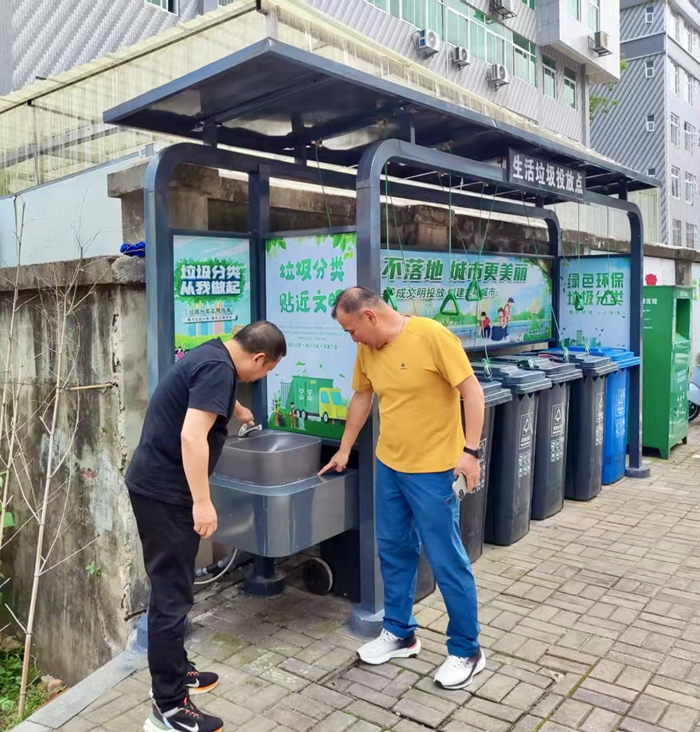 新型垃圾分類亭充分融入了“以人為本”的理念,著眼于提升居民投放垃圾的實際體驗。除了具備堅固耐用、易于清潔的特性外,最大便民亮點在于增設了按壓式洗手池,解決了居民投放垃圾后手部清潔的難題,讓垃圾分類投放過程更加便捷衛生。