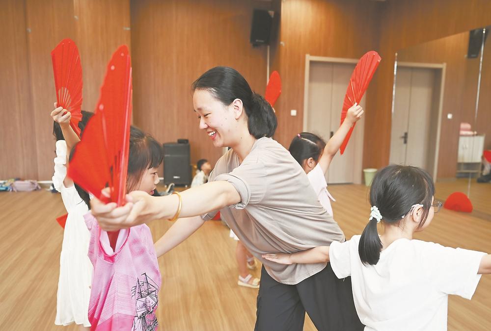7月16日,志愿者周璐洋在公益暑托班上教孩子們舞蹈。