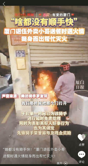 噴光三瓶滅火器,終于壓制住店面火勢。面對超時(shí)處罰,美團(tuán)外賣小哥羅發(fā)芬坦言“用超時(shí)3分鐘換一場平安,值了”。7月25日中午,湖里尚忠社一店面突發(fā)火情,這位曾服役于空降兵部隊(duì)的“95后”小伙毫不猶豫沖上前撲火。這一英雄之舉的視頻短短數(shù)天內(nèi)收獲8.6萬點(diǎn)贊。