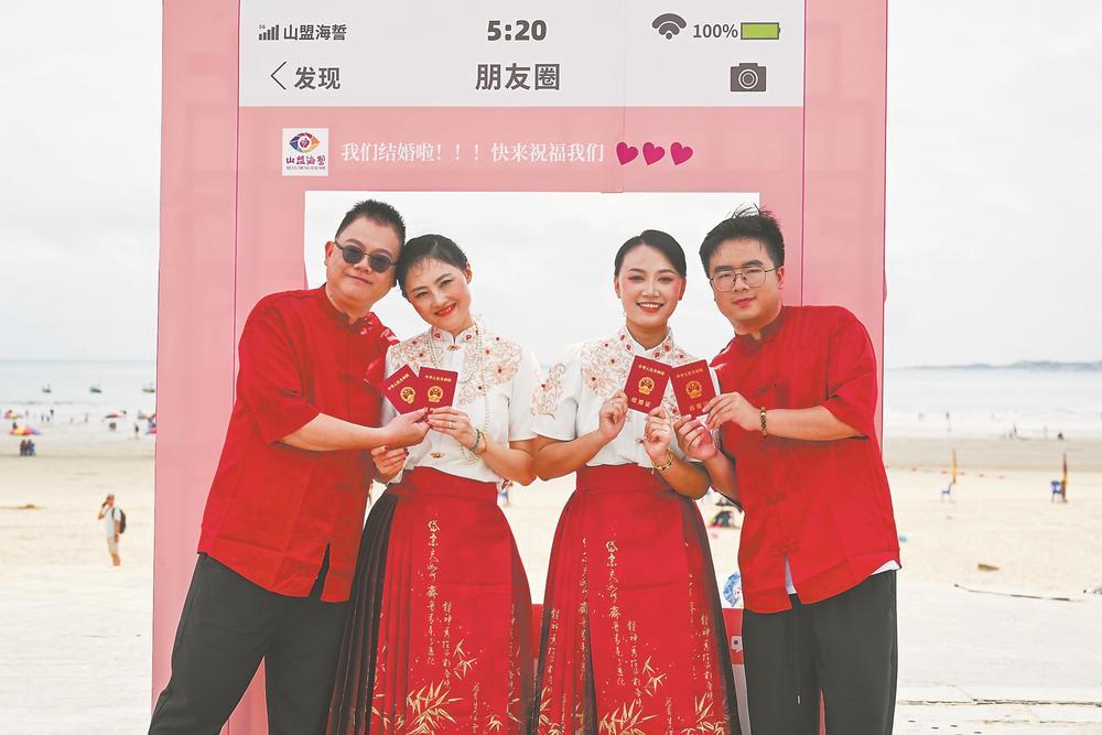 8月30日,平潭龍王頭海洋公園,海風輕拂著衣角,暖陽灑在喜慶的紅毯上。在這里,以“福遇良緣,情牽兩岸”為主題的第三屆閩臺“山盟海誓”集體婚禮浪漫啟幕,11對閩臺新人在此許下“白首之約”。