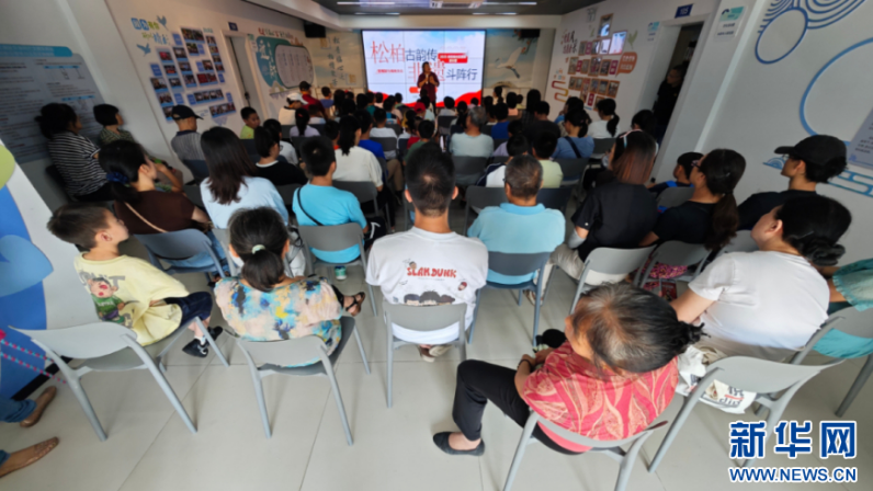 松柏社區(qū)新時代文明實(shí)踐站里,社區(qū)居民聆聽非遺講座。新華網(wǎng) 劉默涵 攝