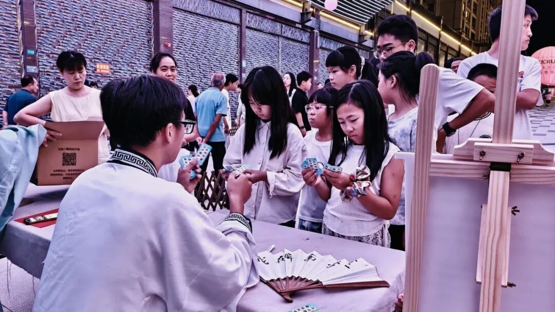廣場熱鬧不減,步行街亦是一派喧騰。市民、游客或體驗漆器制作、剪紙、香囊縫制,感受傳統技藝的魅力;或身著唐、宋、明制漢服巡游打卡,成了一道流動的風景線。而在投壺射禮、盲人擊鼓、簸錢占運等互動游戲前,排起的長隊中不時傳出陣陣歡笑,讓夜游的煙火氣愈發濃厚。