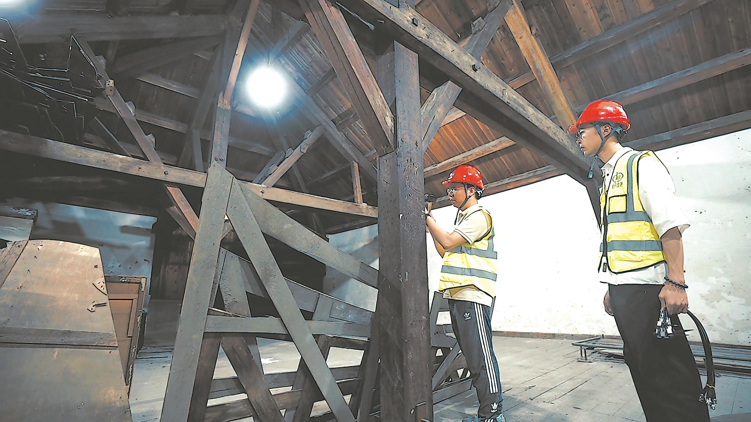 馬尾輪機廠內(nèi),結構檢測工程師正在對木構件進行檢測。溫昭云 攝