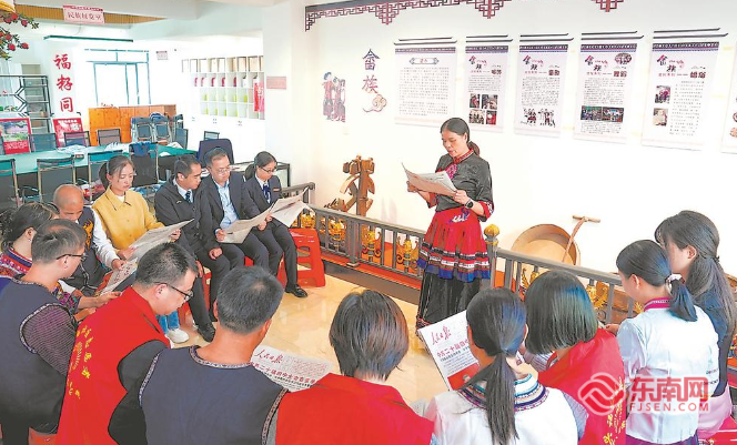 24日,周寧縣獅城鎮興福社區活動室內,社區干部用畬語向畬族群眾宣講黨的二十屆四中全會精神。
