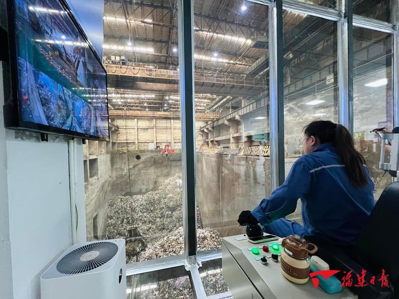 協(xié)同處置廠內(nèi),工作人員正在隔窗抓取儲(chǔ)坑內(nèi)的原生生活垃圾。陳歡歡 攝