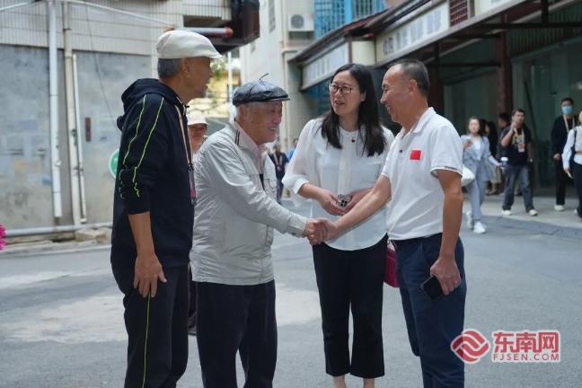 牛犇(左二)走進“百姓院子”,和陳原來(右一)親切握手。海滄區委文明辦供圖
