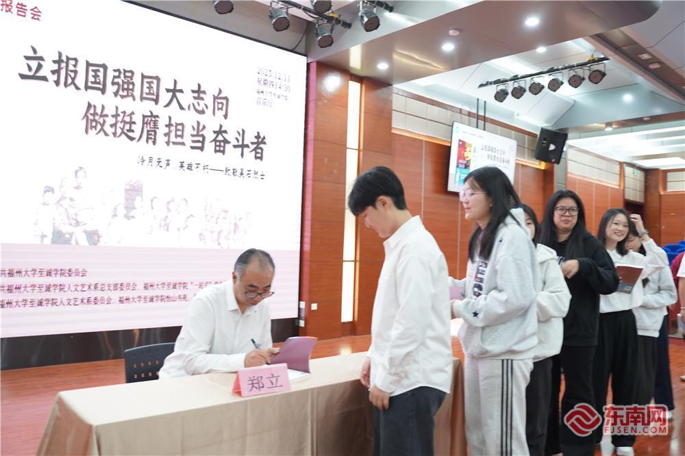 現(xiàn)場簽名環(huán)節(jié),師生們排起長隊。“追完劇再聽鄭老師的講座,很多劇情里沒有的細(xì)節(jié),讓吳石將軍的形象在我心中更立體、更鮮活了。”福州大學(xué)至誠學(xué)院學(xué)生林彥兵難掩激動。學(xué)生賴子馨表示:“獲得這本書對自己而言更是一種精神指引,這讓我更加堅定了去西部支教的決心,要像吳石將軍一樣,為祖國的事業(yè)奉獻青春力量。”