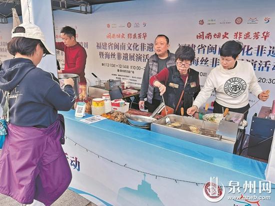 記者了解到,10日至14日,閩南文化非遺周活動的項目之一——“山海交融尋味閩南”非遺美食市集在這里舉行。活動匯集了泉州、廈門、漳州三地50個非遺相關(guān)展位,既有安溪龍居面線、阿滿姨印尼風(fēng)味千層糕、藍(lán)氏鐘樓肉粽、忠記姜母鴨、肖園土筍凍、湖頭米粉、深之源拳頭母、梅蘭浮粿、阿兵哥金淘豆干等泉州本土風(fēng)味,也有古美香品、同安窯珠光青瓷、傳統(tǒng)紙扎技藝(海滄)、漳浦剪紙、閩南貝雕手工技藝、漳州老菜脯傳統(tǒng)制作技藝等廈漳特色項目,美食與手作相映成趣,盡顯“山海交融”的閩南特色。