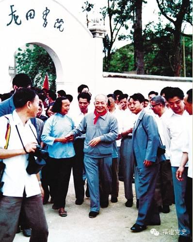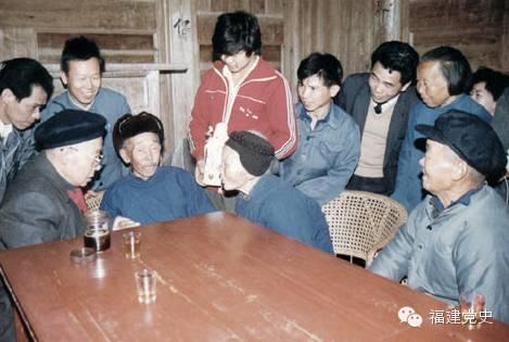 陳丕顯(右三)回到家鄉與鄉親們在一起 1986年5月,時任中共中央書記處書記、全國人大常委會副委員長的陳丕顯在赴龍巖參加會議后,返回家鄉上杭南陽掃墓。其間,他婉拒了親屬為孫子安排工作的請托;得知政府補助祖屋“位三堂”失火修繕款后,又主動要求退還3000元。他以行動詮釋“權力不能謀私利”,彰顯了“權不為私”的廉潔觀。