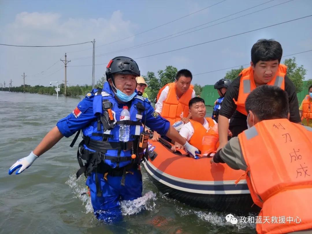 藍(lán)天救援隊(duì)員轉(zhuǎn)移受災(zāi)群眾現(xiàn)場