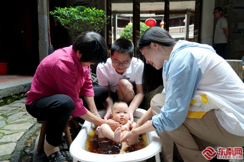 土樓人家給孩子洗午時水。 永定區融媒體供圖