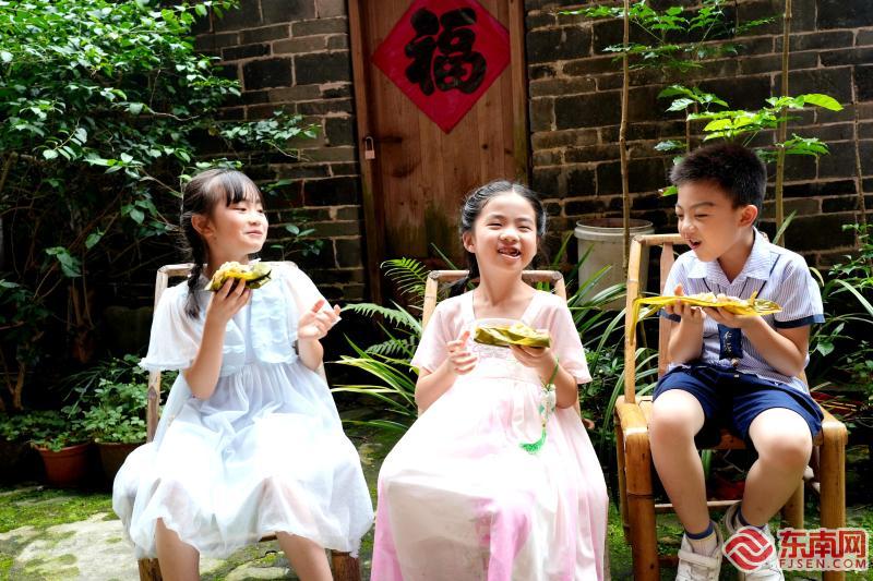 土樓娃品嘗美味的粽子笑開顏。 永定區融媒體供圖