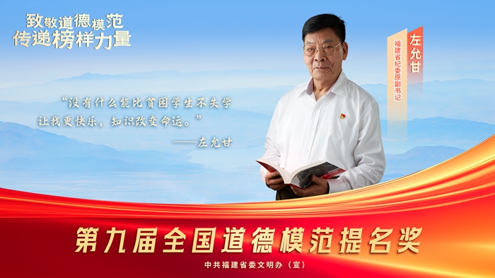 左允甘,男,漢族,1943年10月生,中共黨員,福建省紀委原副書記,第九屆全國助人為樂道德模范提名獎獲得者。2007年,退休的左允甘推動成立了“寧德蕉城樂善助學促進會”,十多年來,他將個人創(chuàng)作的800多幅書畫作品進行義賣,募集善款近700萬元,共資助寧德市蕉城區(qū)、周寧縣1775名貧困學子圓了“大學夢”,幫助20多名特困學子解決困難。他還牽頭實施農(nóng)村貧困殘疾人“安居工程”,14年來,幫助9500多戶農(nóng)村貧困殘疾人家庭圓了“安居夢”。