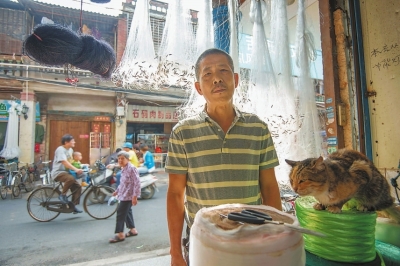 鐘源順,漁具店老板。他所在的老街區曾是入海口的一處商貿魚貨聚集之地,街區與街區之間的交通靠的是小船擺渡。如今陸地已連成一片,傳統的漁具店雖然還在經營,但也都是一些江邊海邊的老客戶。