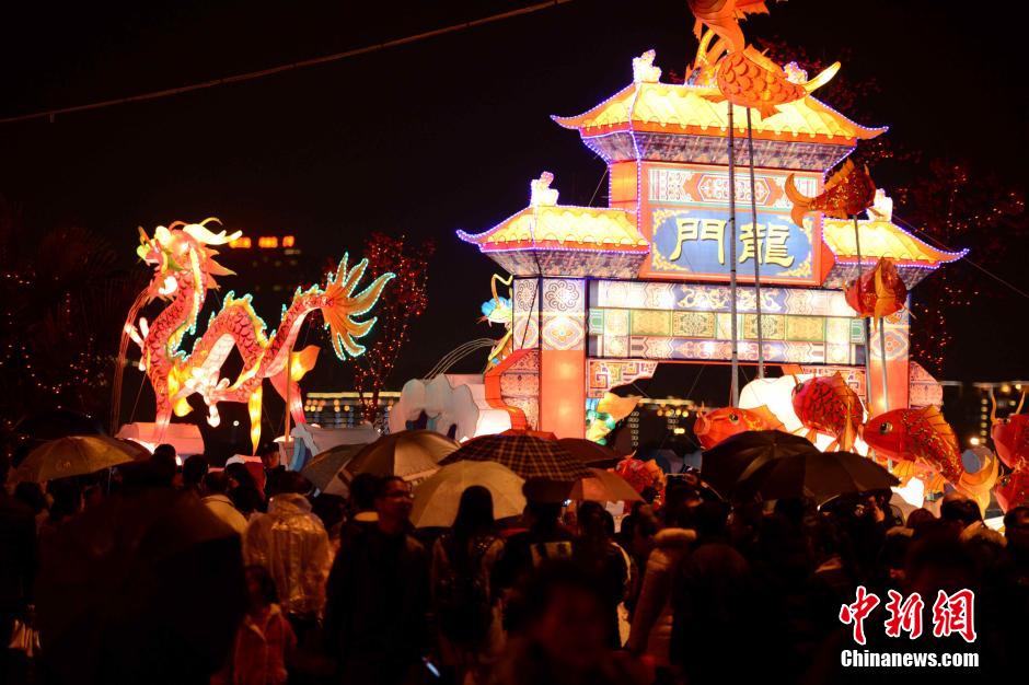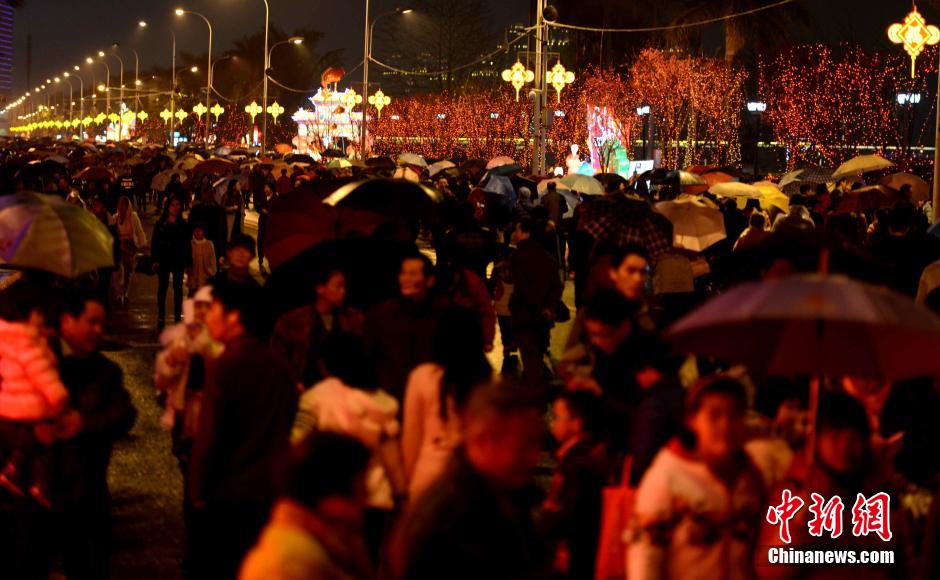 2月19日晚,福州元宵燈會璀璨上演,吸引數十萬民眾觀賞。今年福州元宵燈會按照五個行政區域,沿閩江兩岸布展,與閩江的夜景交相輝映,讓市民大飽眼福。圖為民眾冒雨觀燈。王東明攝