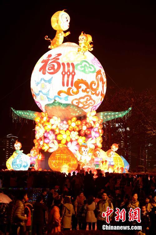 2月19日晚,福州元宵燈會璀璨上演,吸引數十萬民眾觀賞。今年福州元宵燈會按照五個行政區域,沿閩江兩岸布展,與閩江的夜景交相輝映,讓市民大飽眼福。圖為“金猴鬧春”燈組。王東明攝