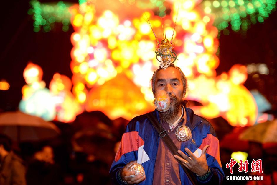 2月19日晚,福州元宵燈會璀璨上演,吸引數十萬民眾觀賞。今年福州元宵燈會按照五個行政區域,沿閩江兩岸布展,與閩江的夜景交相輝映,讓市民大飽眼福。圖為民間藝人燈展前雜耍手藝。王東明攝